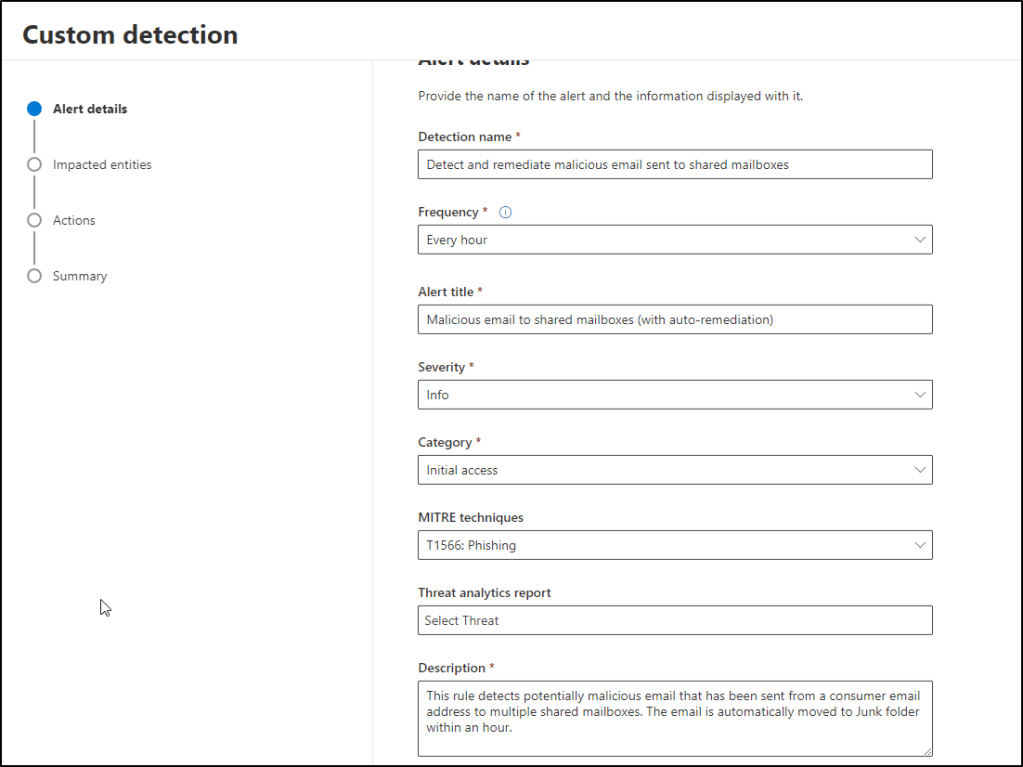 Overall, the custom detection rules are very handy, when you want to perform automatic remediations for certain scenarios, that might be complex with Microsoft Sentinel automation/playbooks. We could also leverage other information available in Defender XDR, e.g., use the EmailAttachmentInfo and/or EmailUrlInfo tables to further correlate information. But in our case, we wanted to catch the first mail, which doesn’t have any links or attachments. It’s still not perfect, as we have the 1 hour window, when the user may respond to the email, receive the reply, and then click the link. But it’s good first step, and we can easily use the query for threat hunting first, and tweak the query accordingly.