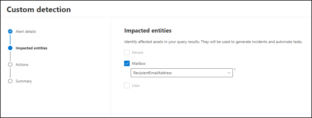 Select RecipientEmailAddress under Mailbox as the entity. This way we can target remediation actions for that mailbox.