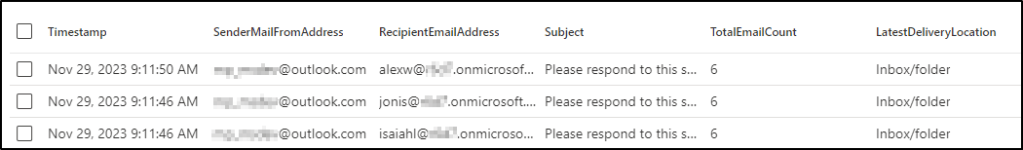 By running the query, you can see the results. Each line represents a recipient, and the TotalEmailCount shows the total number of recipients that got the email from this sender. The query will filter out emails that have already been remediated by using LatestDeliveryLocation column (we’ll see how this works later in the blog).
