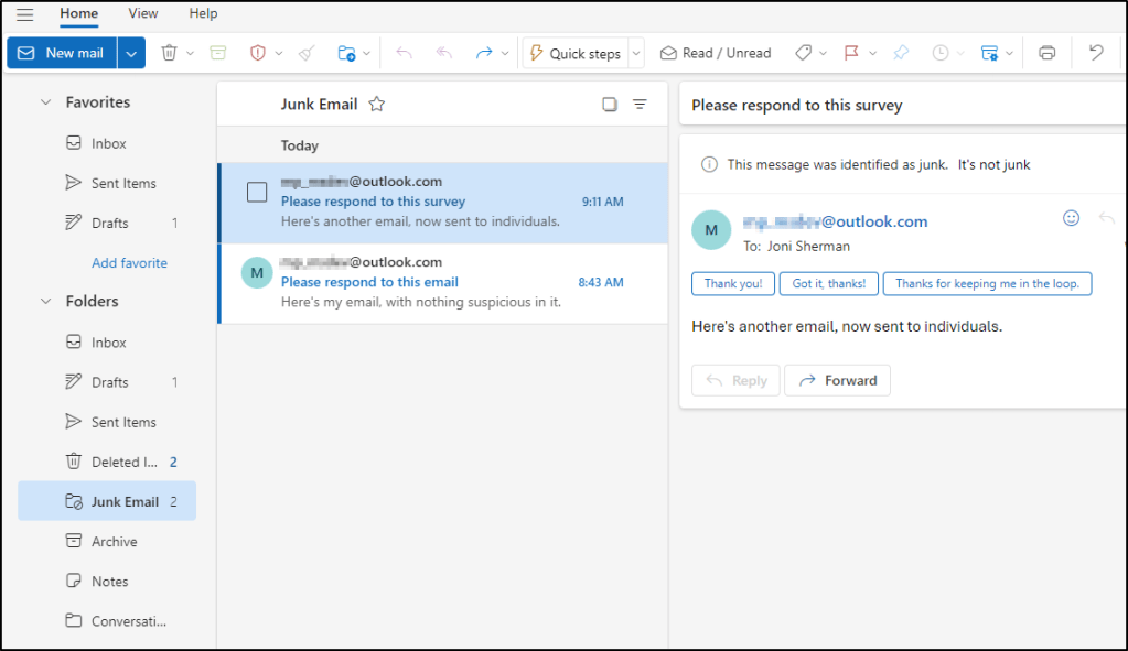 And lo and behold, both emails are indeed in the recipient’s Junk Email folder: