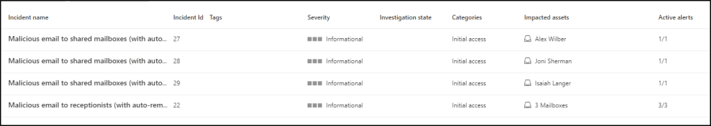 After an hour, the detection rule is triggered again. In the Incidents page, there are now four incidents. The first email that we sent to multiple recipients triggered one incident an hour earlier (with 3 mailboxes), while the individual emails will each trigger their own incident.